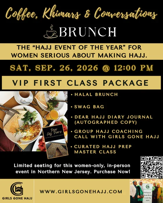 Coffee, Khimars & Conversations Brunch Saturday, September 26, 2026 12:00 PM 5:00 PM GGH New Jersey United States (map) Google Calendar ICS This ain’t just brunch. It's where your Hajj intention meets action, community, and clarity. Seats are limited and reserved for women who are serious about Hajj and ready to build with others walking the same path. Learn more Learn more